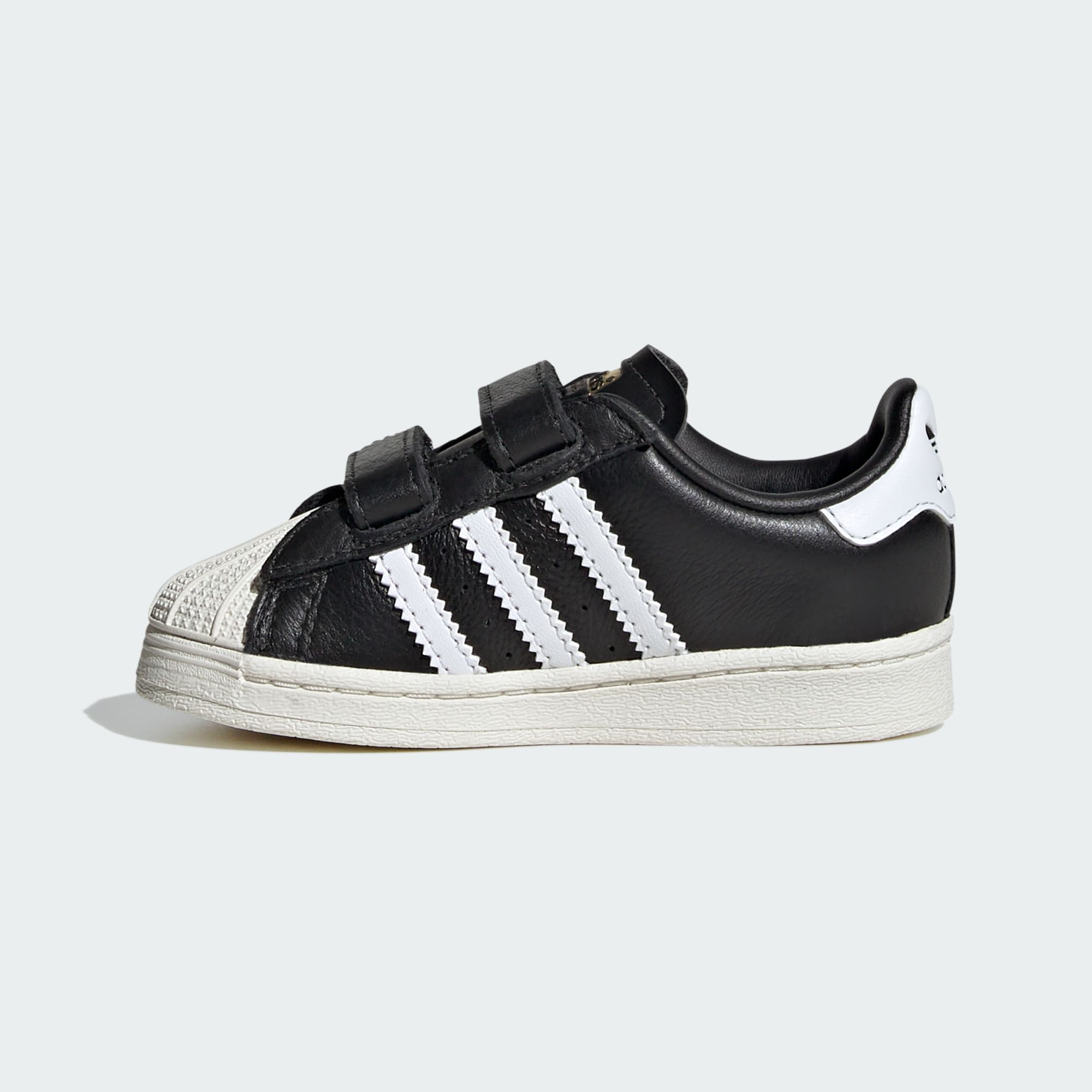 These adidas x Hello Kitty Superstar shoes are an icon shaped for little feet. Made with smooth leather inside and out, they have hook-and-loop straps that make them easy to fasten. Hello Kitty details on the sides add extra fun and whimsy. An OrthoLite® sockliner provides instep comfort, while the adidas Superstar's signature shell toe leads the way. The Superstar has been a hit for over half a century. Sized right for little feet and bubbling with Hello Kitty details, little kids will love where this shoe can take them.