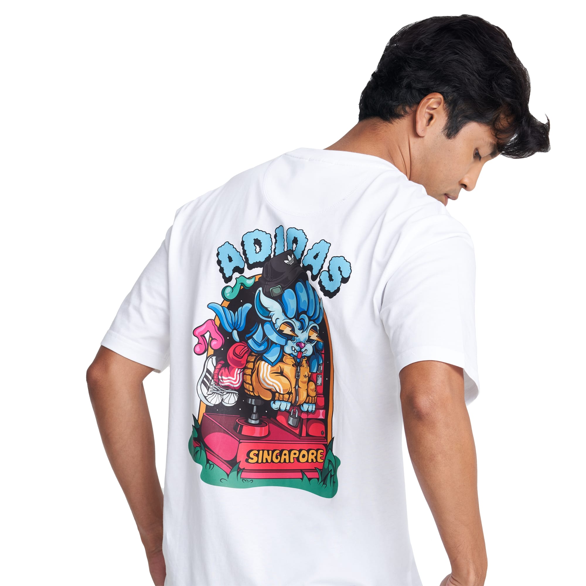 The illustration on this cotton tee depicts Singapore’s official mascot, the Merlion, as a coin-operated kids' ride commonly seen in heartland malls of yesteryear. Local artist Erikartoon (Erika Tay) puts a video game-inspired spin on the mascot, dressing it in iconic adidas Originals to blend childhood nostalgia with modern style.