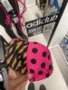 I ordered a size L because usually I’m in-between a M or L and triangle bikini tops usually run small for me. I’m between a 36B-34C/D and the L fits great, no spillage and the right amount of coverage for my comfort. I love how the back of the cups have different patterns, one has the monogram the other has brown polkadots with a pink background. From the front side it gives the top a cool effect, it reminds me of a gradient from one side to the next. The sequins is smooth and the string ties are thick/stretchy so you can adjust it to your liking.