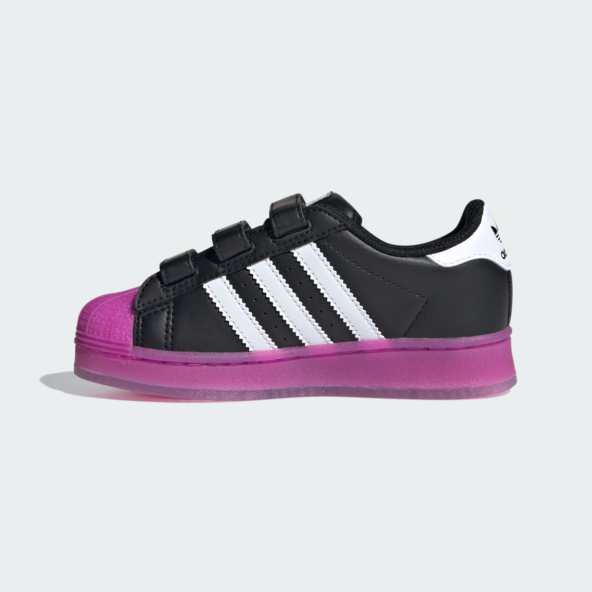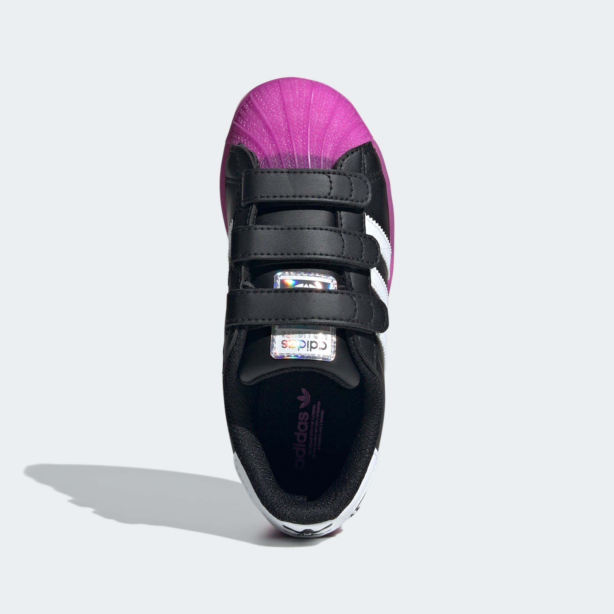 These kids' shoes stay true to adidas Superstar trainer DNA while introducing a modern, eye-catching twist. Seamlessly integrated LED lights with an easy-to-use on/off button shine bright inside the semi-translucent cupsole, so kids can illuminate every step. These playful trainers are more than just footwear – they're a statement, a conversation starter and a promise of a mesmerising light display.
