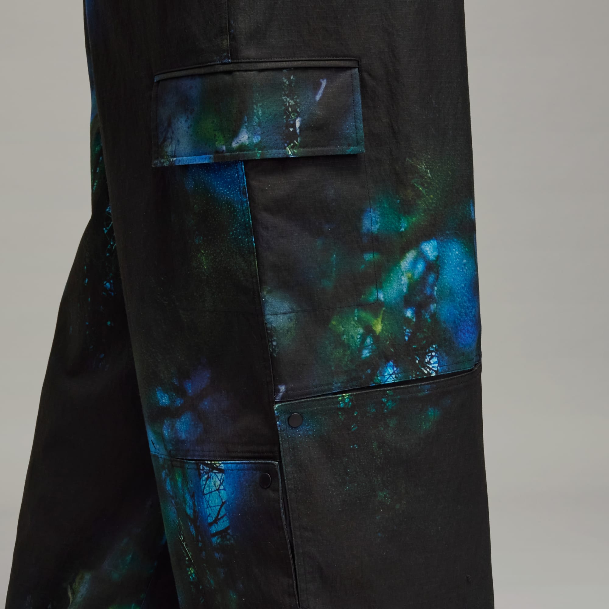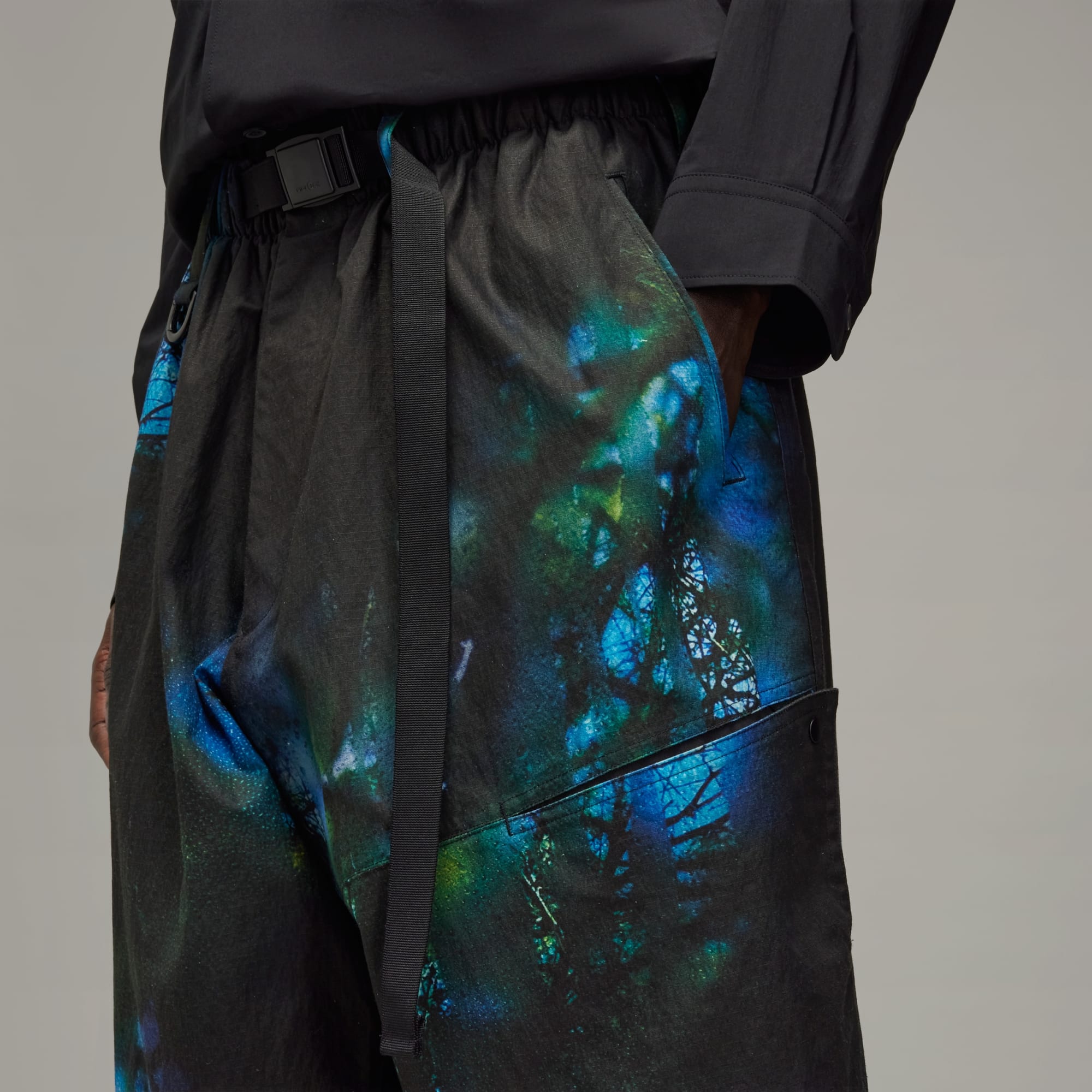 A photorealistic print on the Y-3 AOP Cargo Pants is inspired by landscapes seen through rain-covered windowpanes. The utilitarian silhouette is constructed from cotton-blend ripstop, with practical features including an integrated belt and snap-button vents.